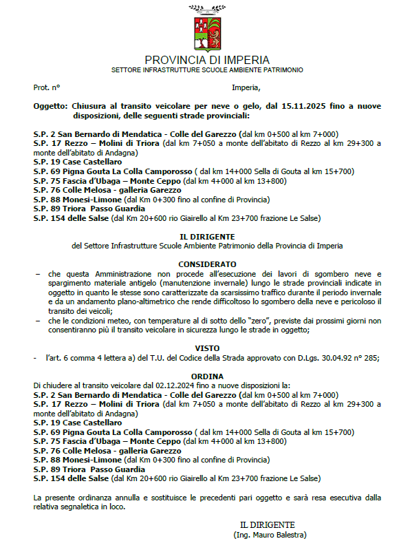 delle Strade Provinciali indicate nell'Ordinanza n. prot. 0030044 del 12/11/2025.